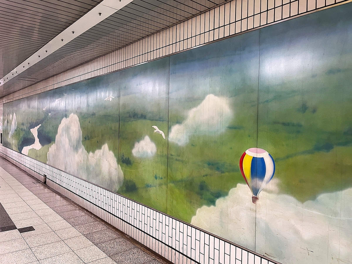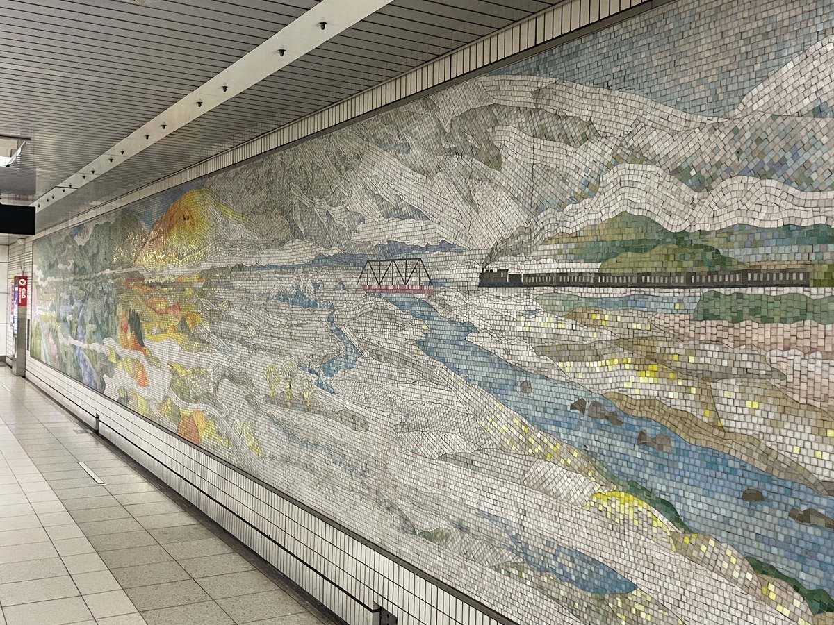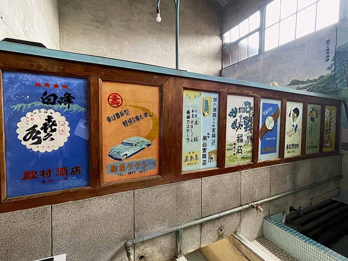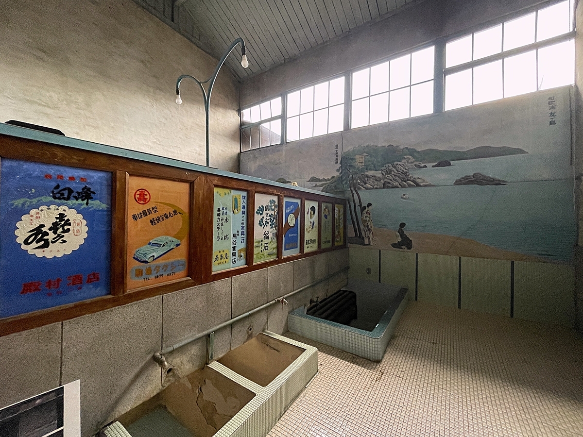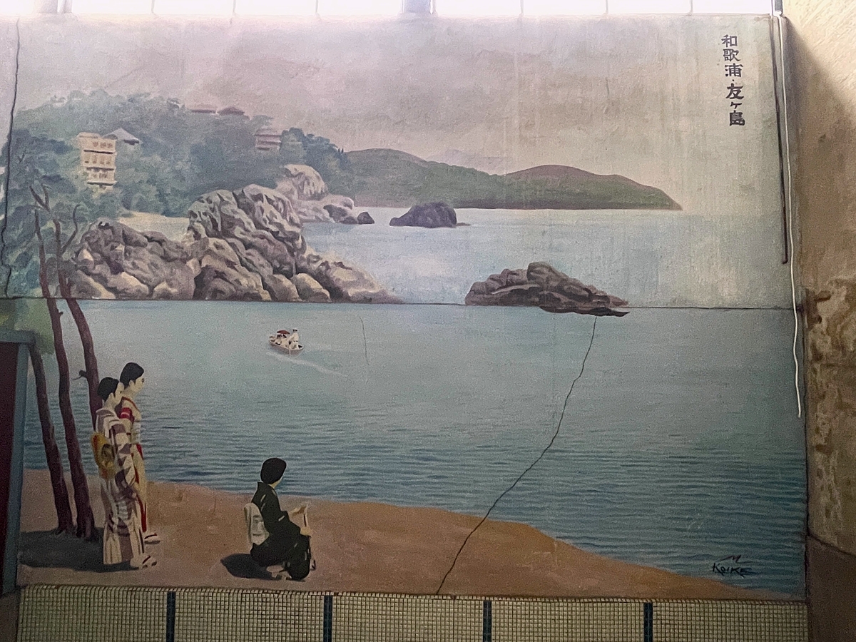 現在の浴室は1970年の前回の大阪万博の時に作られたもの。大きな台風の折に流されてきた地元の岩を貼ったそうで、壁には松の木があしらわれています。