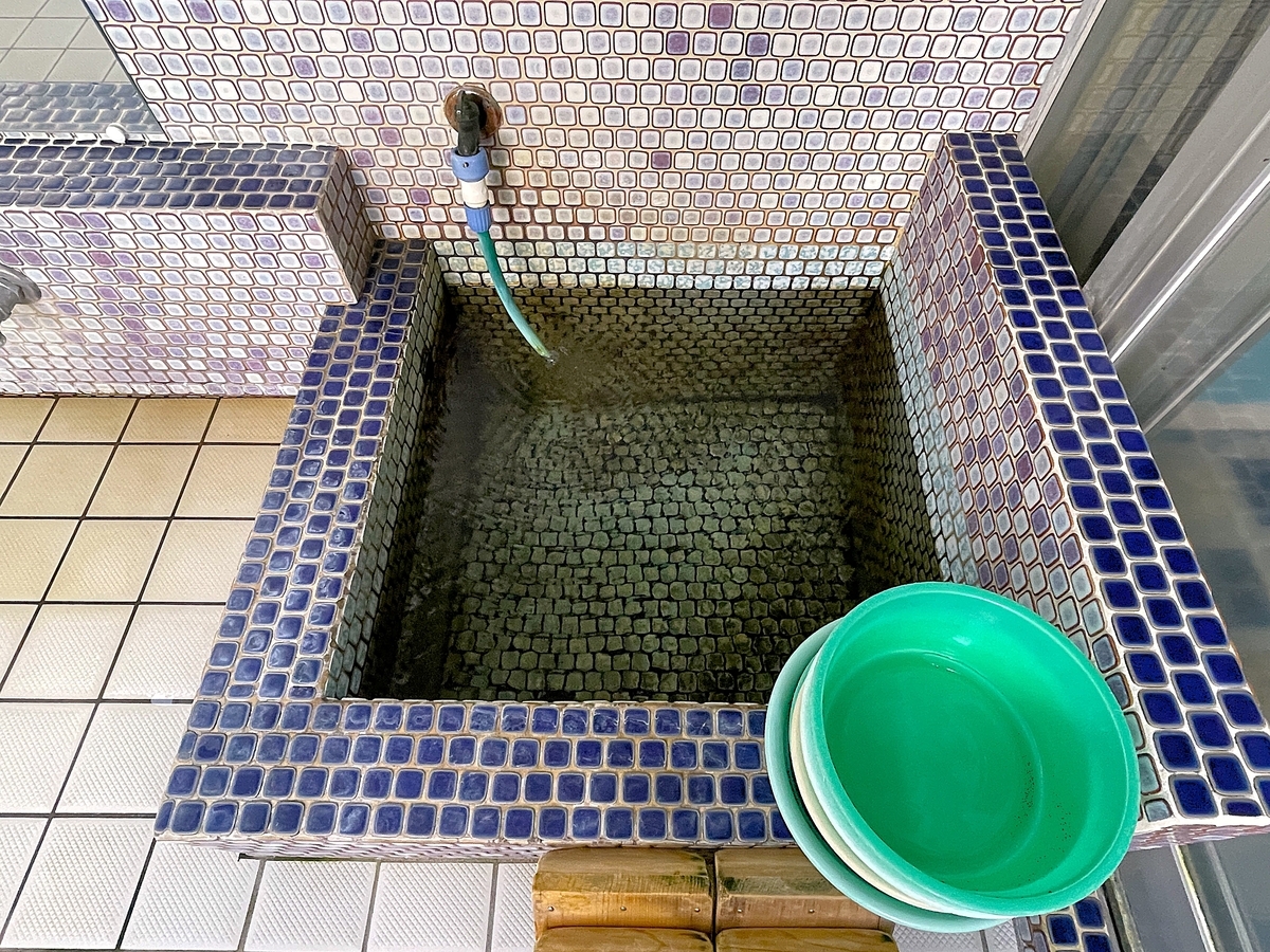 湯舟にはナトリウムー炭酸水素塩泉の沸かし湯が満ちています。