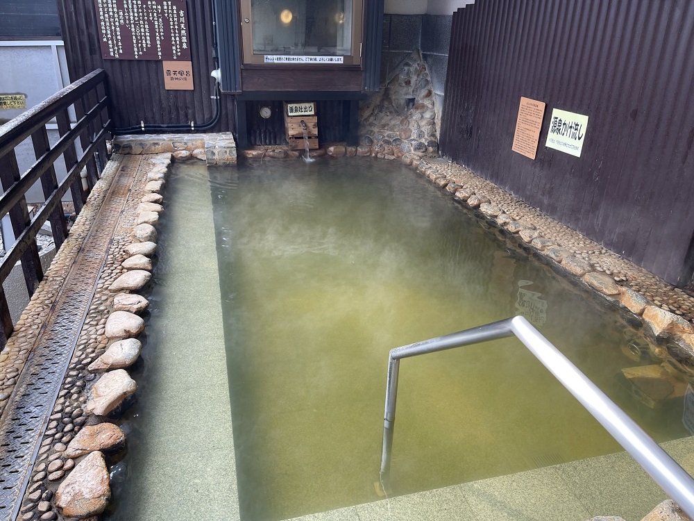 ※写真は「吉川天然温泉ゆあみ」さんの右浴室源泉かけ流し露天風呂(成分総計20,640㎎/㎏の高張性)↓