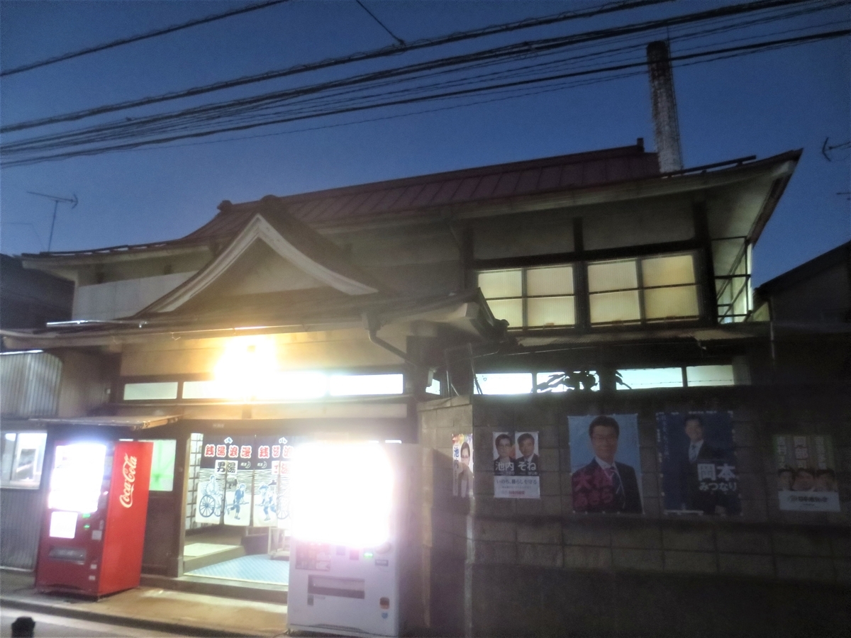 宵闇が迫る中、路地の先右手に岩の湯さんの灯りが見えてきます