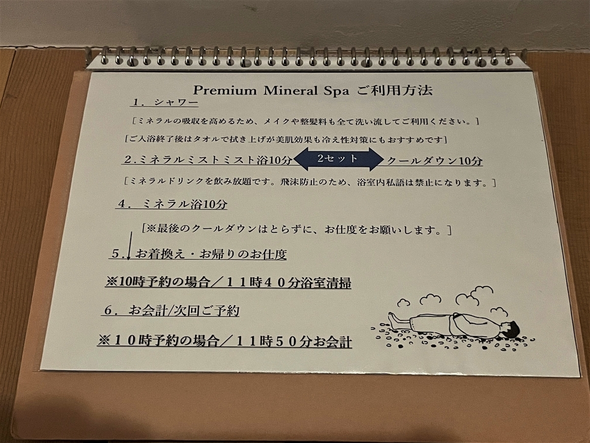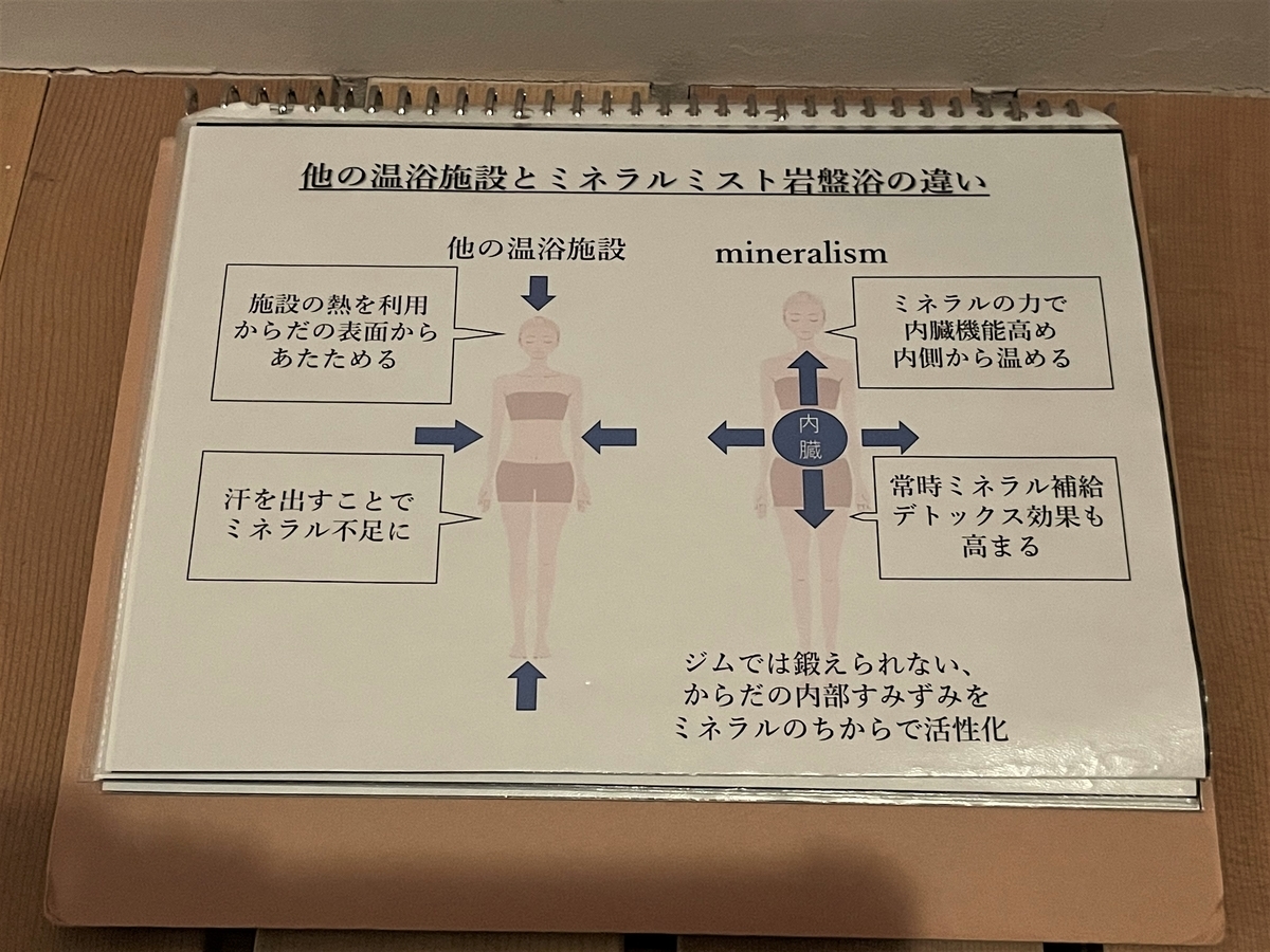 何故に女性専用施設に!?と思われる方もいらっしゃるかも知れませんが、実はコチラは元々は男女利用可施設で、普通に予約して向かったのですが、現地スタッフより『2022/6/1より女性専用施設に変更します』と伺い、変更前に予期せず利用出来た為です。ところでミネラル岩盤浴とは!?スタッフが丁寧に説明してくれました。