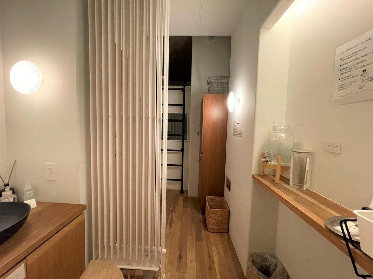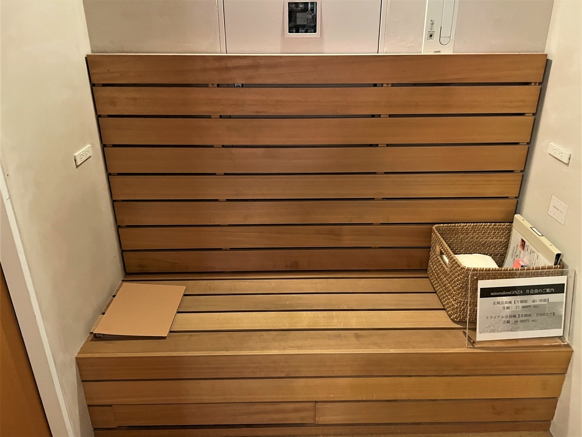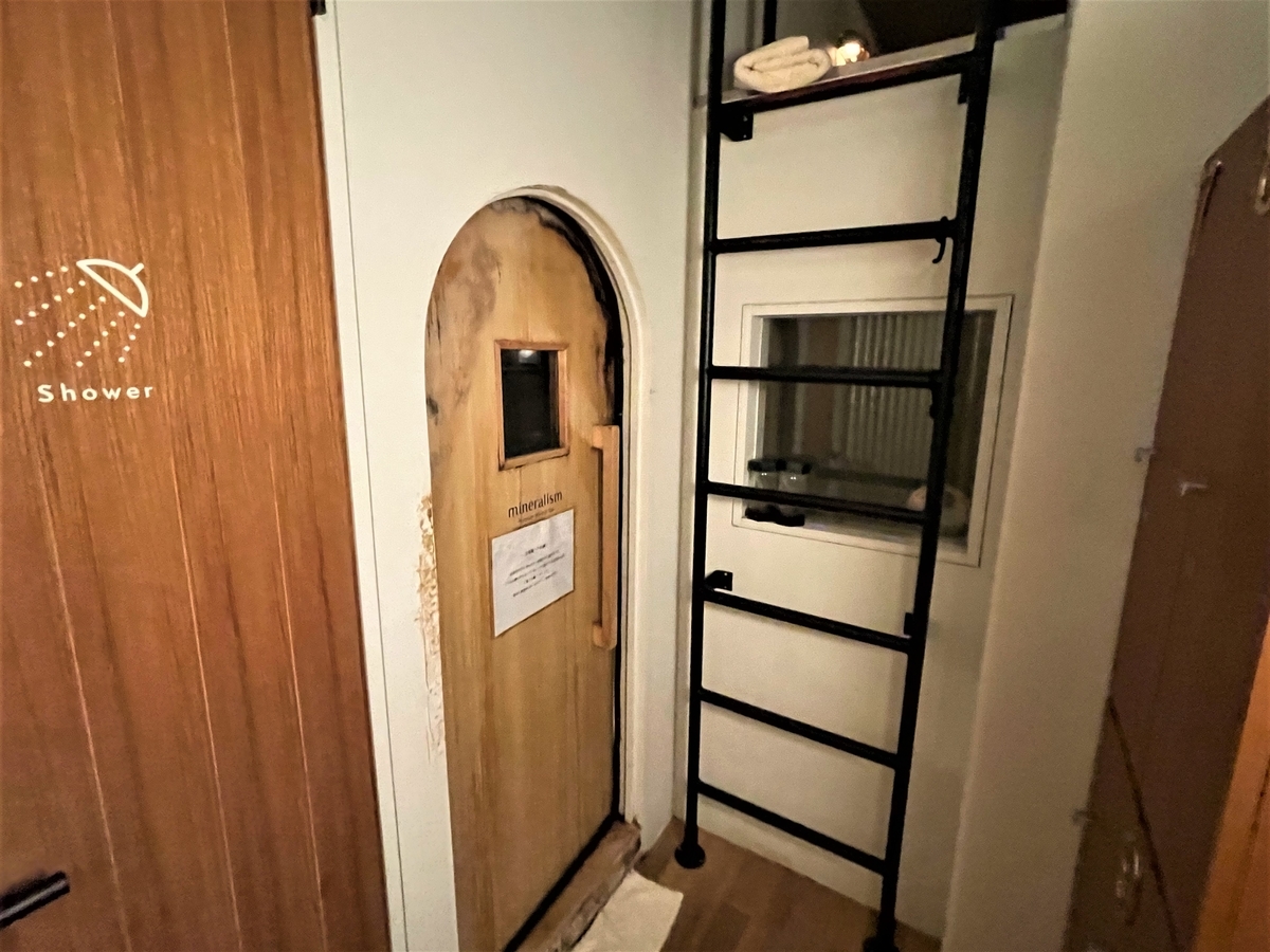約10分発汗したところで入口側のベンチか、ミネラル岩盤浴室上のロフトスペースで暫し休憩。ロフトスペースは梯子で上りますが、サーキュレーターもあり涼めます。