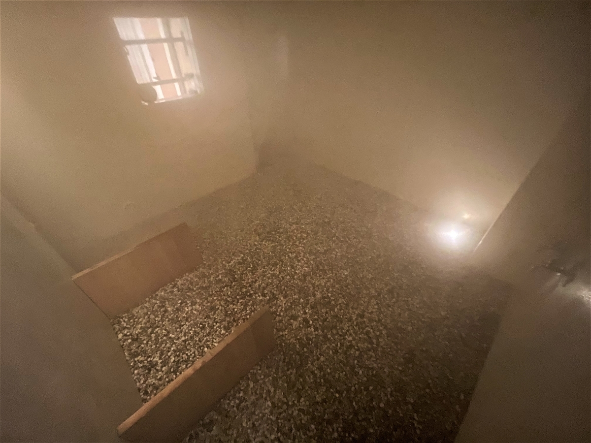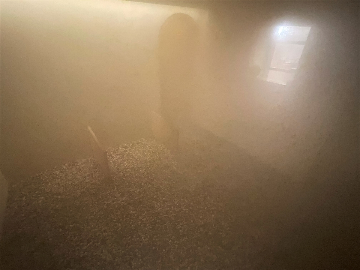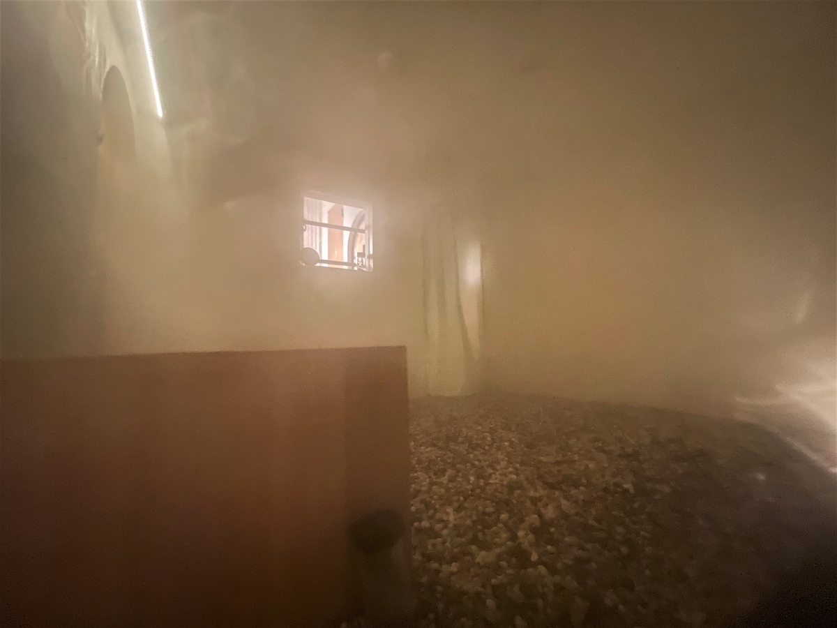 こちらは岩盤浴スペースから入口側を見た景色(ミストで不鮮明なのはご容赦をw)。