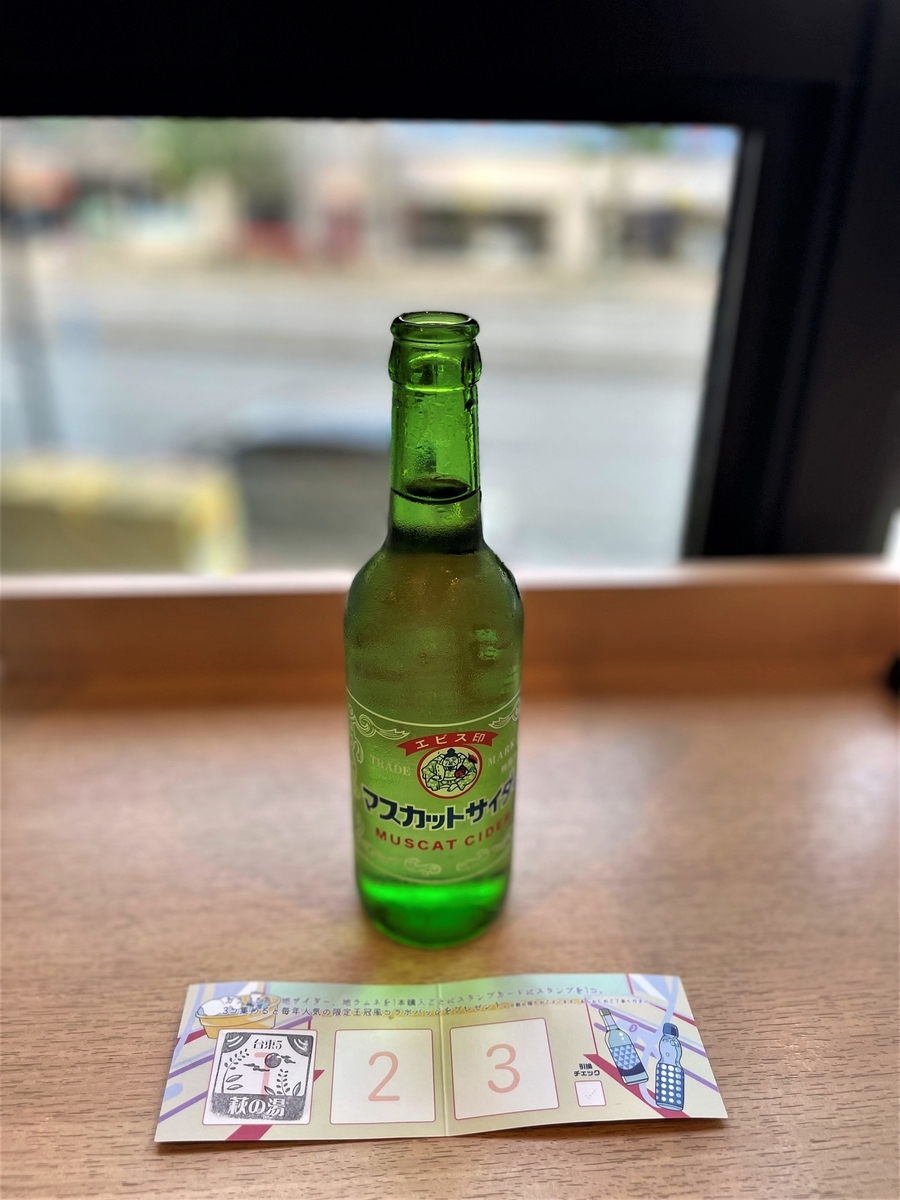 湯上り後はガラスびん地サイダー&ラムネでマスカットサイダーをチョイス。