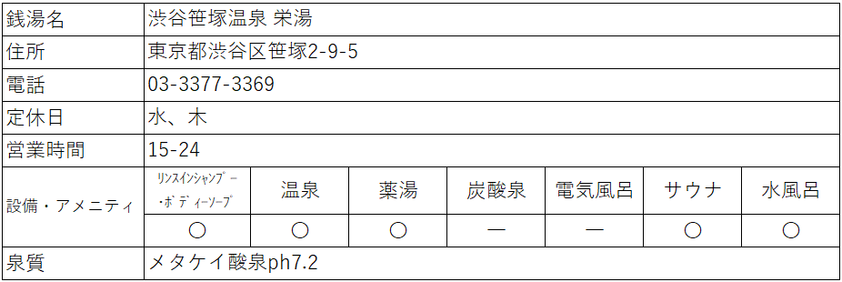 渋谷笹塚温泉 栄湯さんのお湯は、全て美肌天然温泉のメタケイ酸泉(化粧水に多く含まれる成分の為、保湿効果が高く美肌の湯と言われています)です。