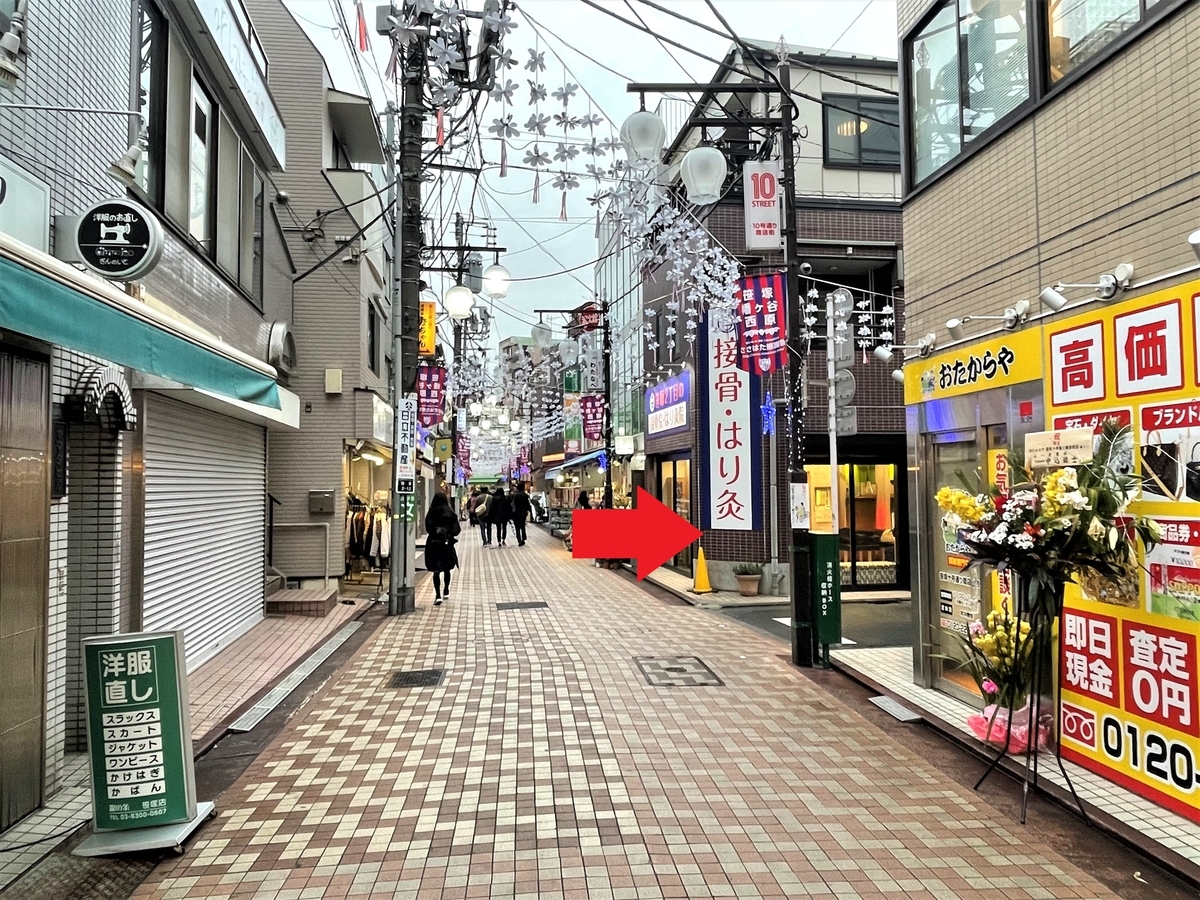 首都高の高架下、甲州街道を渡り正面の十号通り商店街へ。