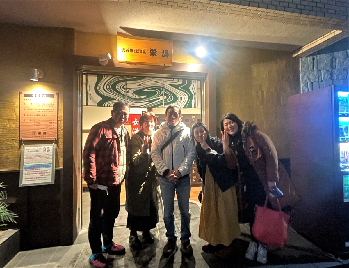湯上り後は、三々五々とロビーで集合し、栄湯さんの店頭で記念撮影をパチリ。