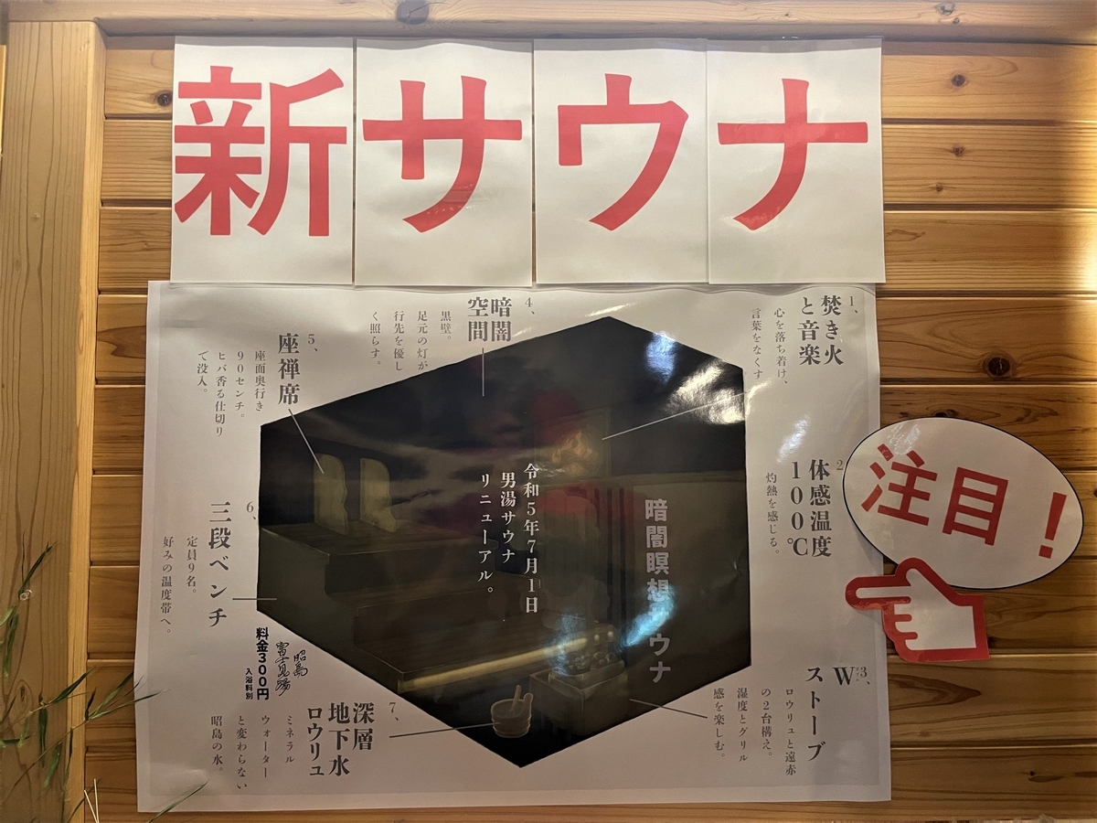 ポスターにもありましたが、生まれ変わった男性サウナは、「暗闇瞑想サウナ」。