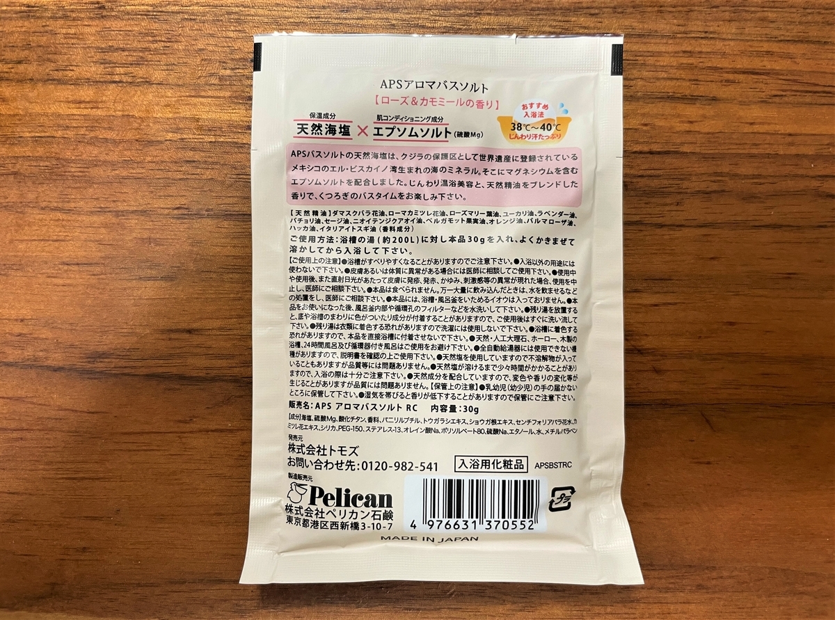 コチラは薬局とオンラインショップを展開するトモズのOEMで株式会社ペリカン石鹸が製造したAPSアロマバスソルトシリーズ。