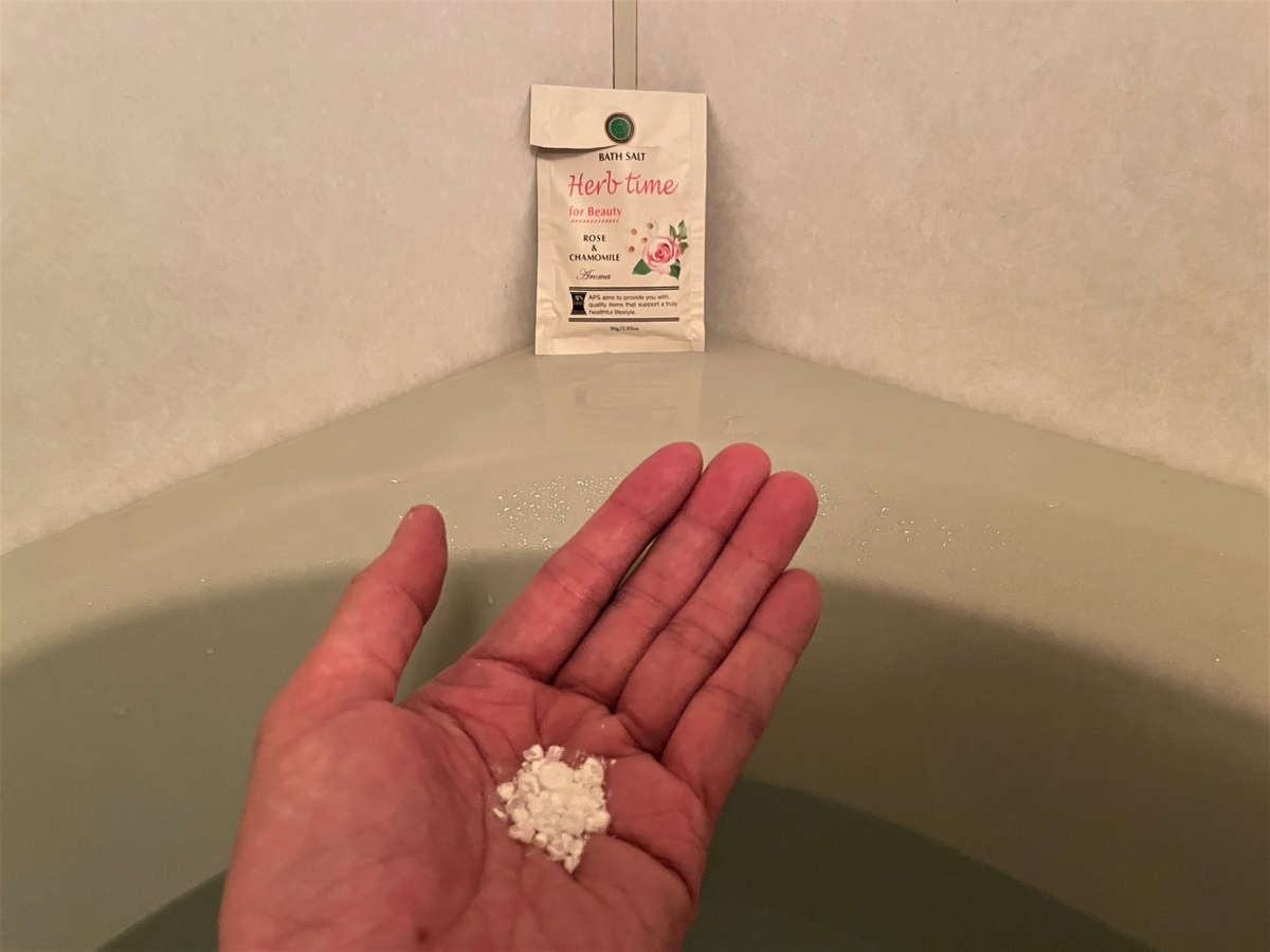 入浴準備を済ませ、開封し掌に開けてみるとこれぞ結晶状のバスソルト。