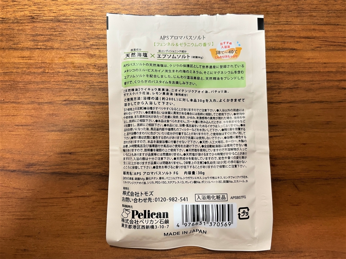 コチラは薬局とオンラインショップを展開するトモズのOEMで株式会社ペリカン石鹸が製造したAPSアロマバスソルトシリーズ。