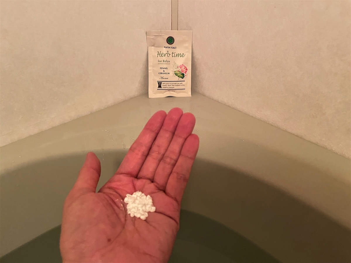 入浴準備を済ませ、開封し掌に開けてみるとこれまた結晶状のバスソルト。
