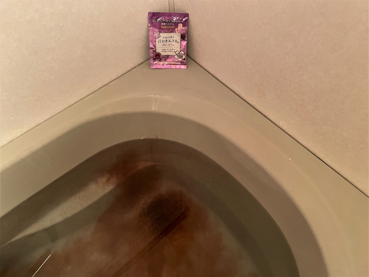 全身お清めでサッパリしたところで風呂蓋を開けてみるとロゼワイン色の湯に。