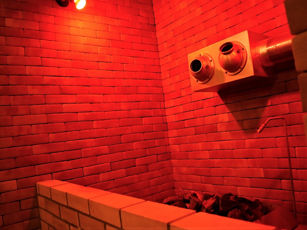 15分に1度程度、赤色灯が灯りブロアから強烈な熱波が5分近く吹き荒れますので、室内は常時灼熱空間。その分、湿度も適度にある為、ヒリヒリ感は然程ありません。
