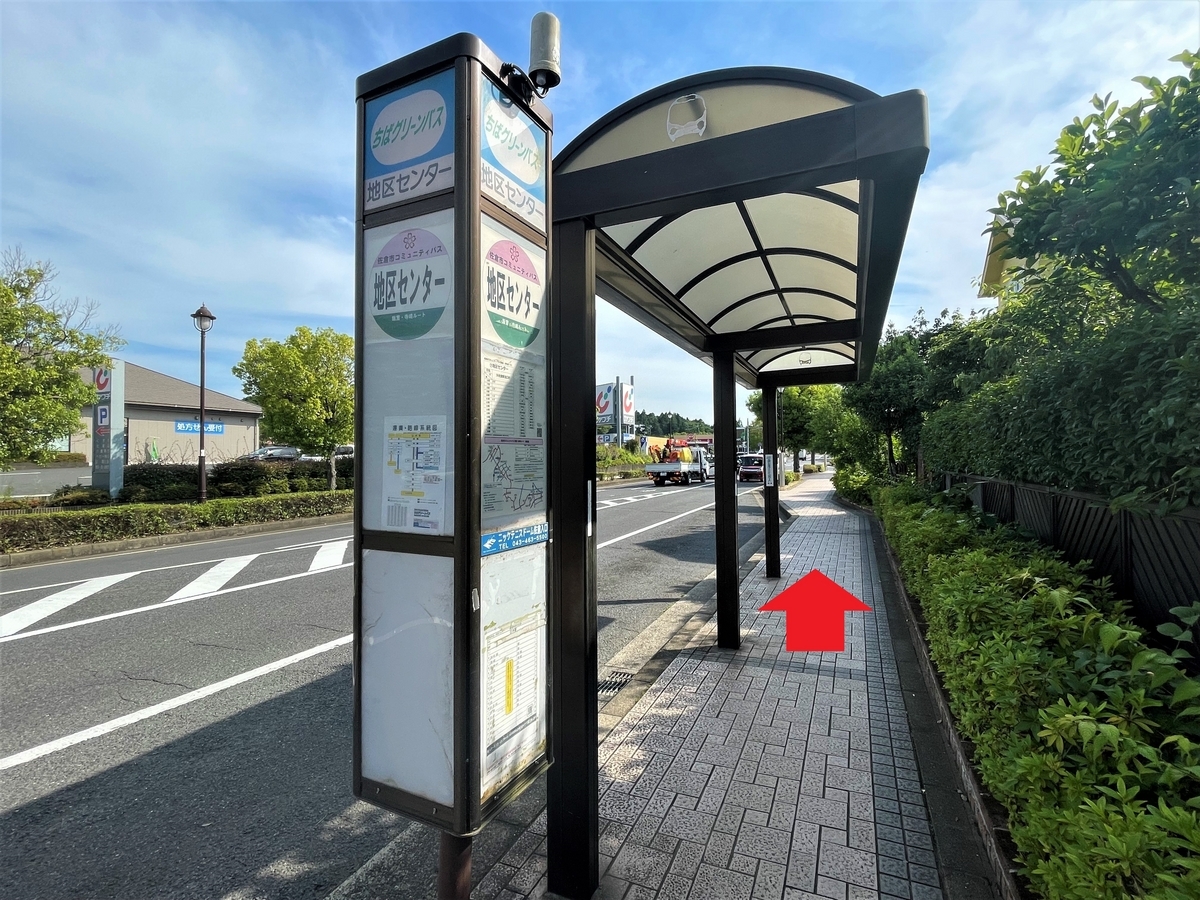 最寄の地区センターバス停で下車し、バス進行逆方向へ。