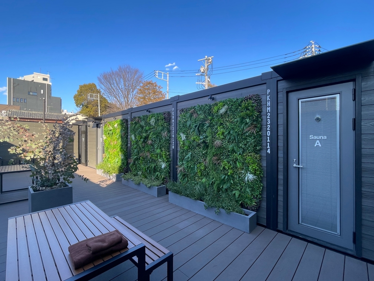 左手の観葉植物で覆われた壁側がサウナ棟で、A棟、B棟、C棟の内、ビジター利用の場合、A棟、B棟の2つが利用可能との事。A棟、B棟にそれぞれ2つのサウナ室があり、一度に4つのサウナが体験が出来るとの事で一気に楽しさ4倍増wwww
