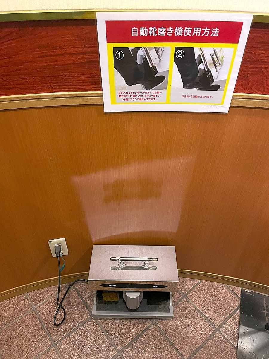 翌朝、出発時に玄関で自動靴磨き機を発見。出張族には嬉しい配慮ですね。