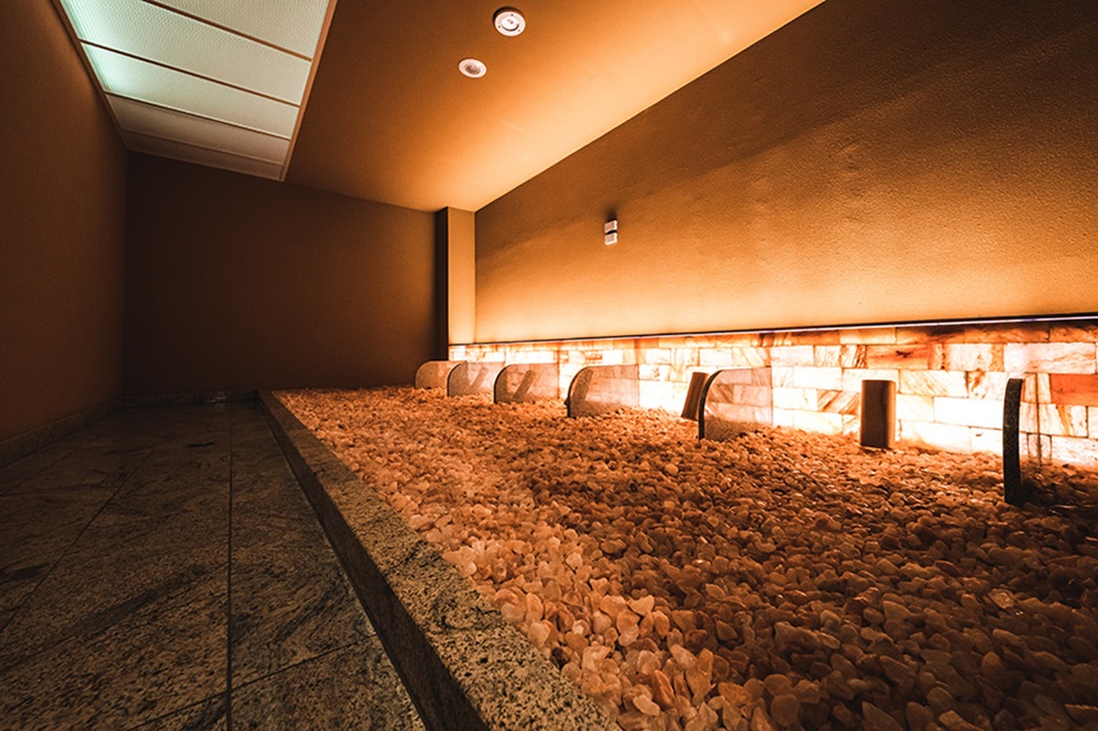 大粒の河原の石状の岩塩でお腹の上にも乗せてサンドイッチ岩盤浴が楽しめます。