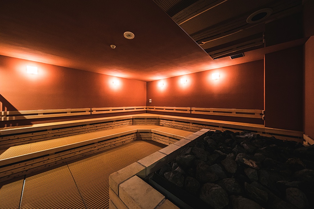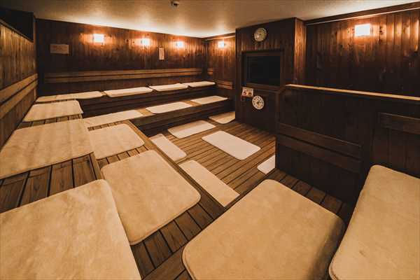 プルガマのような巨大サウナストーブをコの字型に囲む低温サウナ。