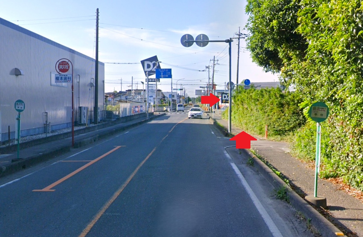 最寄りの中分バス停で下車したら、そのまま夕陽が丘通りを矢印の方向に直進し、ケイヨーD2パーキングの看板の手前を右折。
