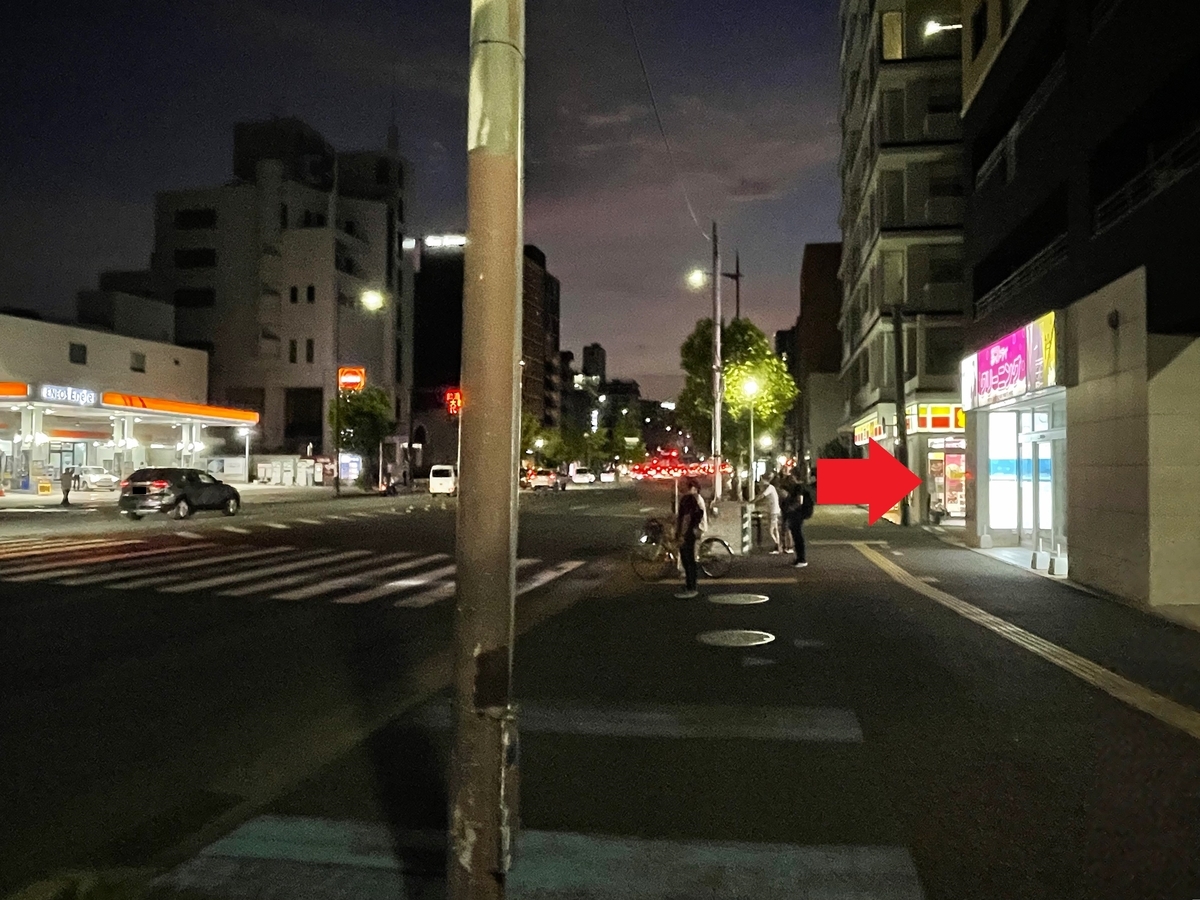 下の写真のクリーニング店の先、デイリーヤマザキの手前を右折。