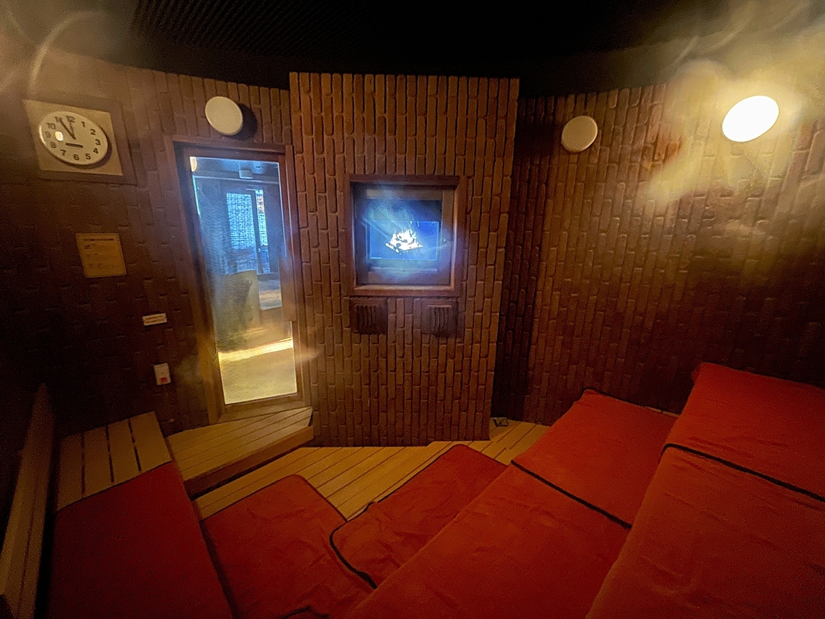 15分に一度オートロウリュが落ちる仕様で、ジュワーッという音と共に高温蒸気が背面上部から降り注いで来ます。目の前のモニターの焚火を眺めつつ、熱気を堪能。