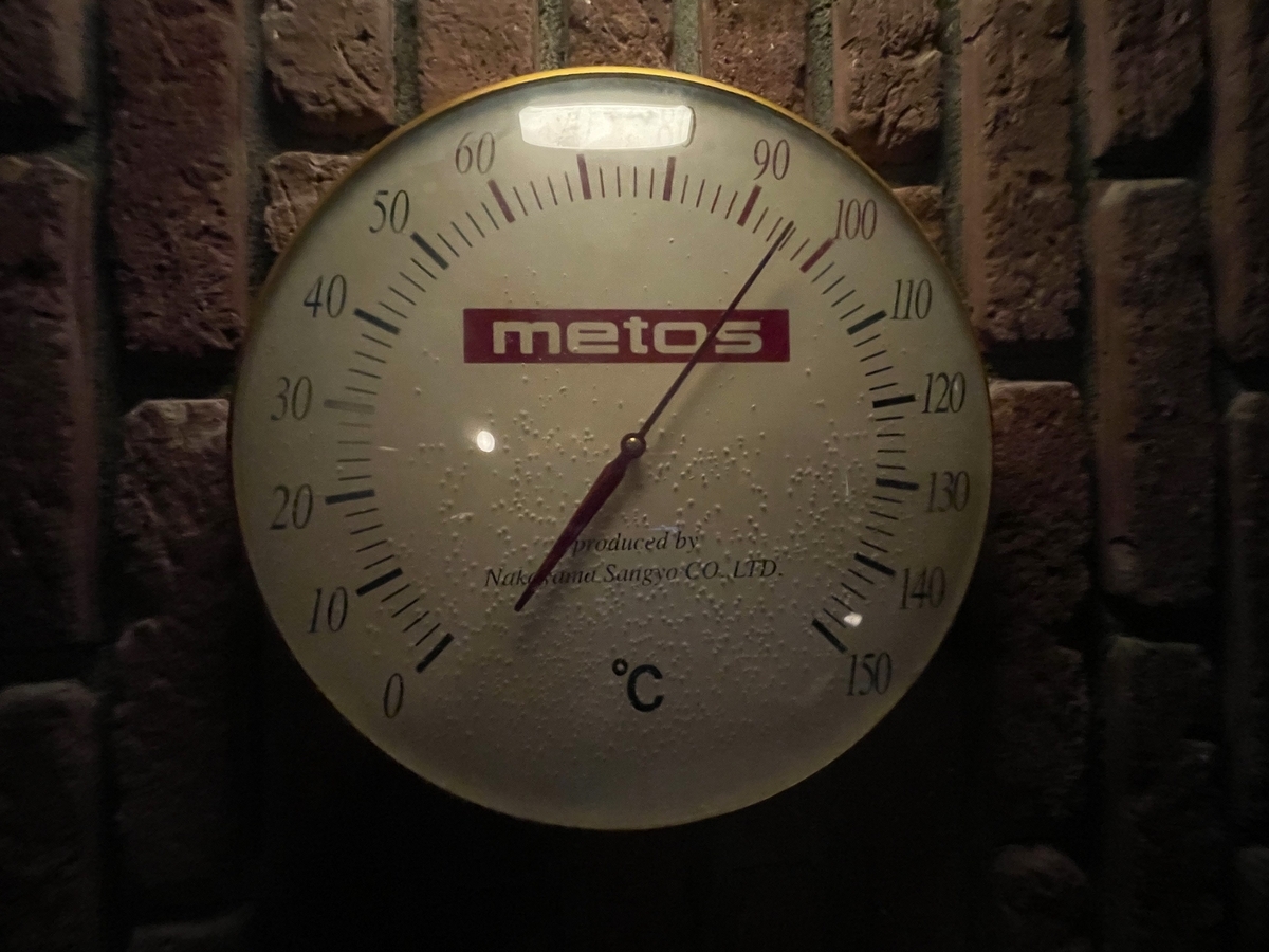 渋谷文化進化Saunaは、カプセルホテル渋谷のサウナを継承したボナサウナで湿度高め。この日は室温96℃。室温計の結露が湿度の高さを物語っています。