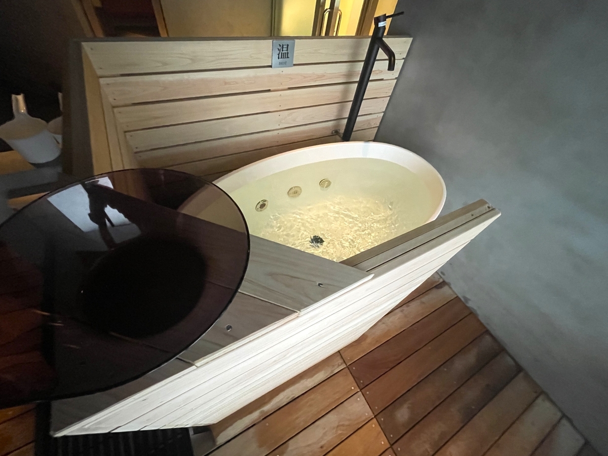 まずはシャワーブースで全身お清めを済ませ、卵形の温浴槽からライド温♨