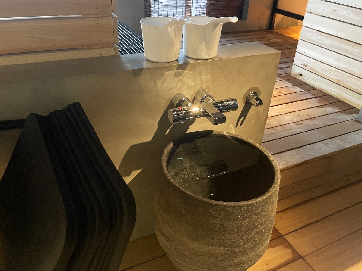 タップリ発汗した後は、サウナ室前の掛け湯で汗を流し・・・