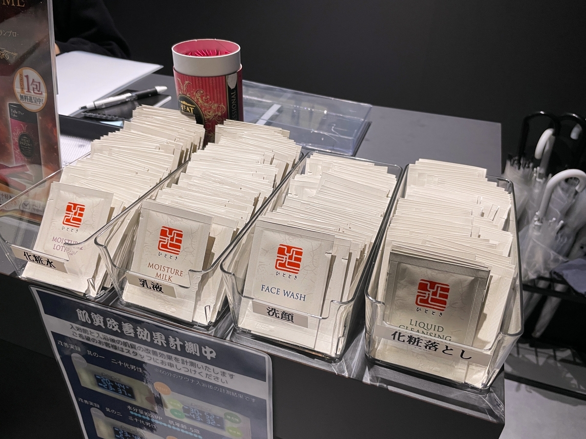 フロントで会計を済ませ、カウンターで選べるアメニティをチョイス。