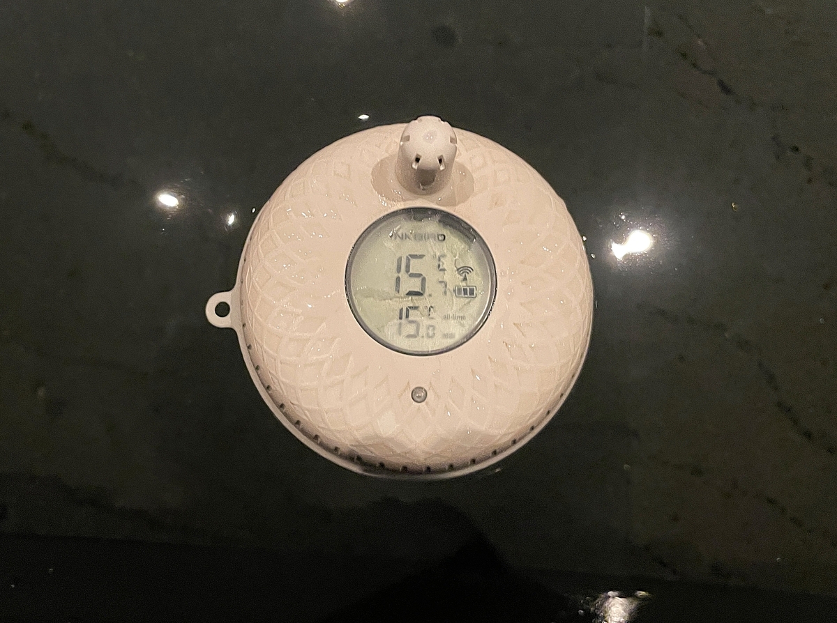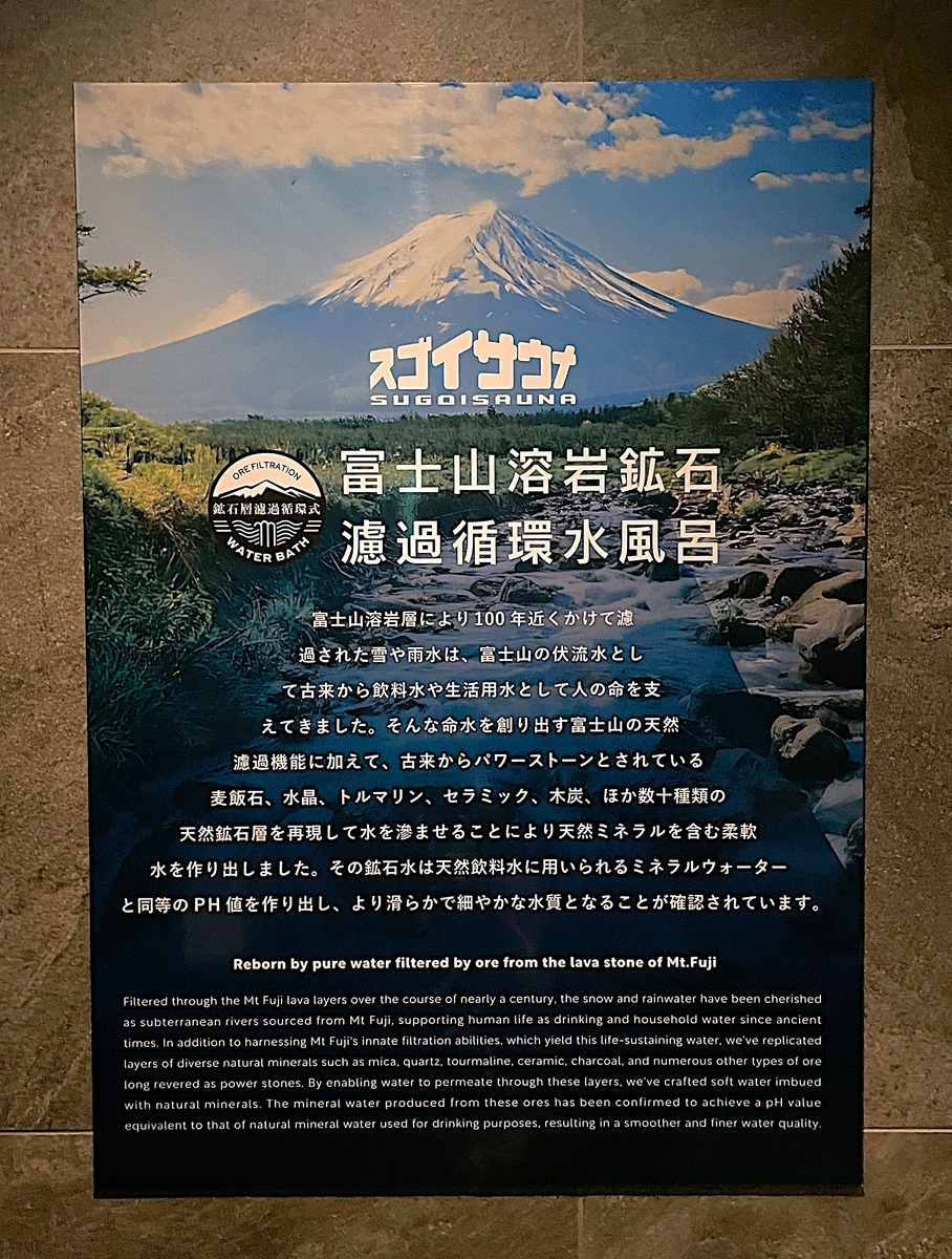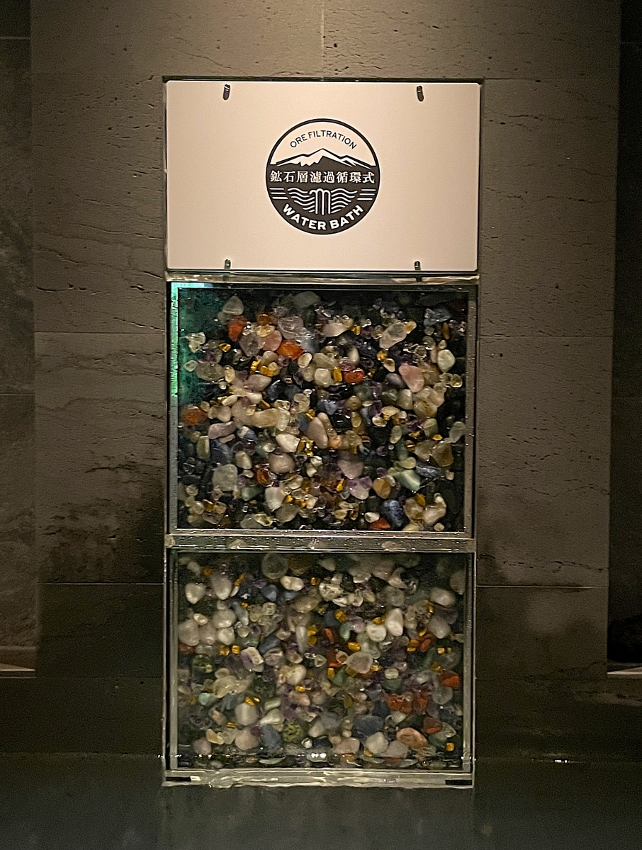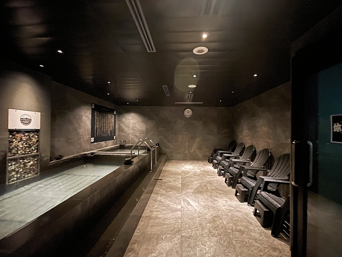 水風呂正面のガラス窓内に富士山溶岩鉱石が詰められ、そこから冷水が静々と水風呂に注がれています。水温15.7℃でキリッと爽快なクールダウンが楽しめます。