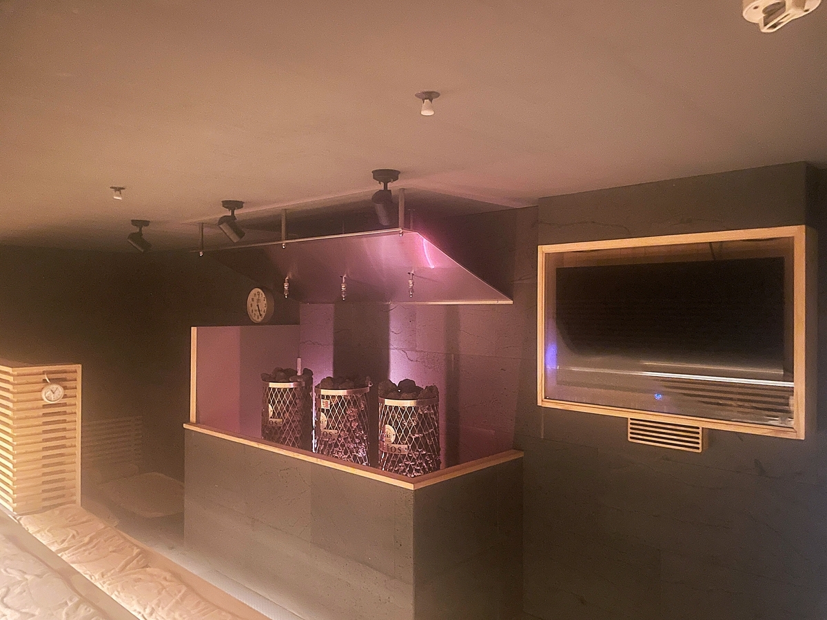 スゴイサウナ五反田駅前店さんのサウナは、壁面を富士山溶岩石で固め、METOS社のikiヒーターを3基配したマグマスパ式サウナ。室内は白く煙り、ストーブ周りをピンクの光が妖しく煌めきます。コレは細胞を活性化させ、免疫を向上させる育成光線。