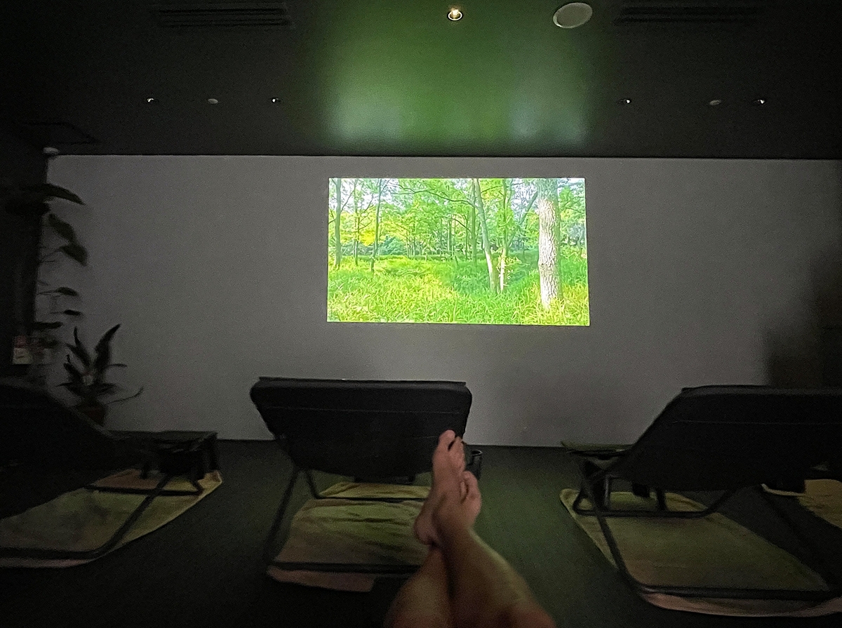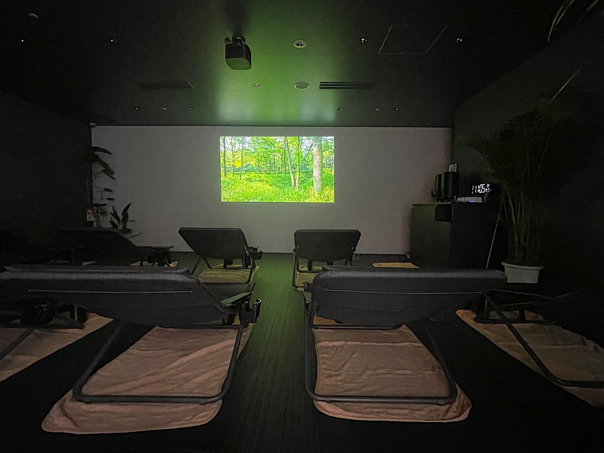 ととのいスペースに流れるのは森のせせらぎと鳥のさえずり。ユーカリのアロマが炊かれ、目を瞑ると深い森の中にいるような感覚になります。