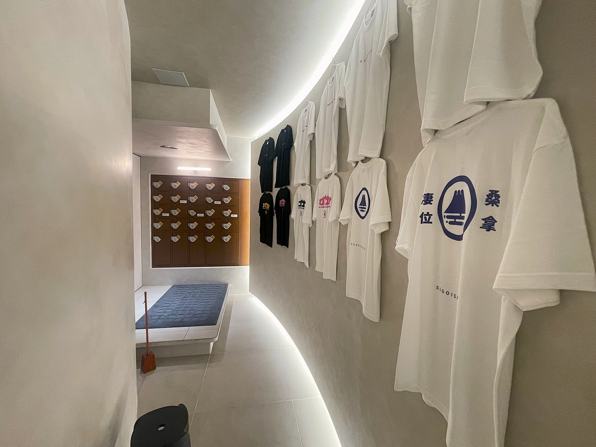 暖簾を潜ると長いアプローチにTシャツ等が飾られ、奥が下足箱、その先が更衣室。