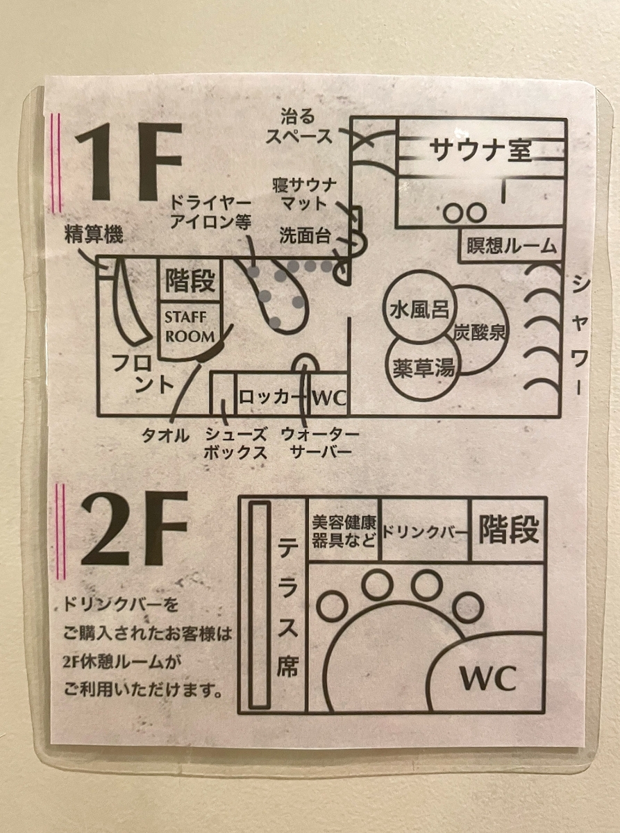 コチラは浴室内の案内図です。1Fがサウナ&浴室で2Fは内気浴&外気浴スペース。