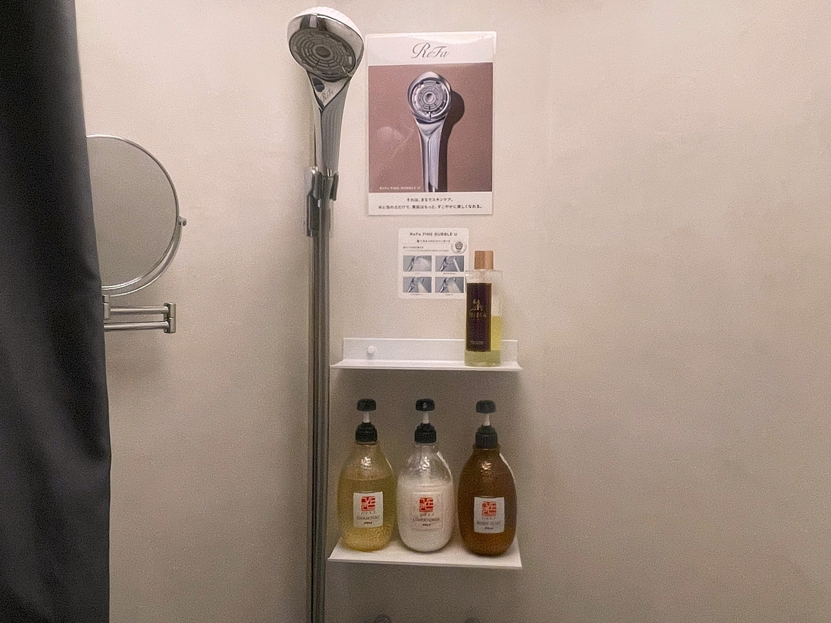 まずはシャワーブースで全身お清め。アメニティも一通り揃っています。