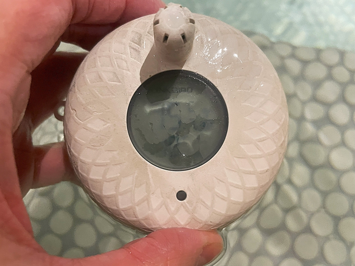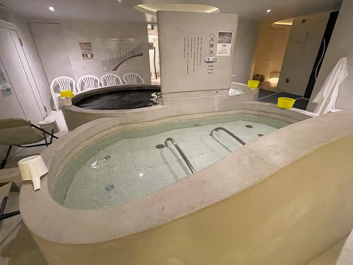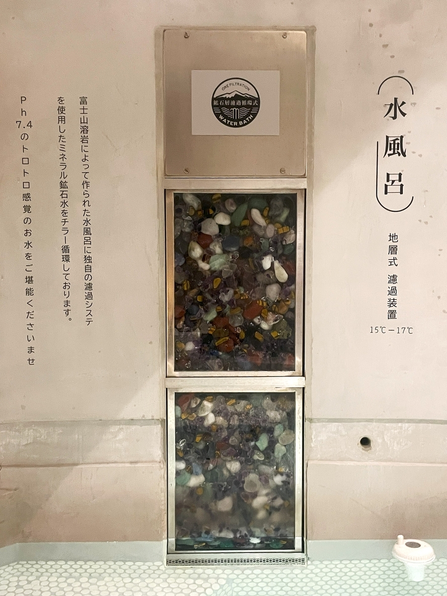 発汗後はサウナ室お隣の水風呂へ。こちらは富士山溶岩の他、各種ミネラル鉱石で富士山の地層を疑似再現した装置で濾過した人口の富士山系伏流水水風呂。