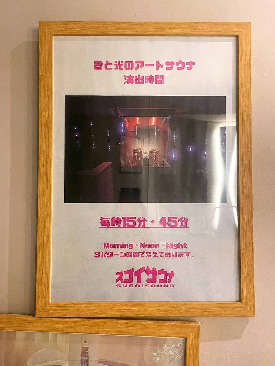 また、毎時15分と45分には、光と音のアートサウナと題し、オートロウリュが落ちて、パンカルーパーより熱風が送られる為、体感温度はかなり高くなります。
