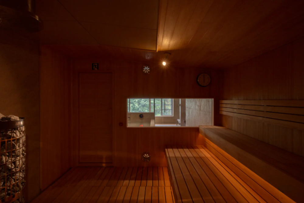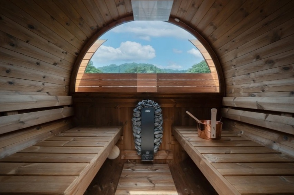 正面の窓からは高尾山が一望!室温は74℃程とマイルドですが、セルフロウリュも可能で、ストーブに水を灌ぐと、一気に樽状の室内が灼熱に包まれます。