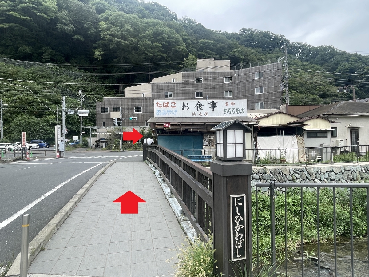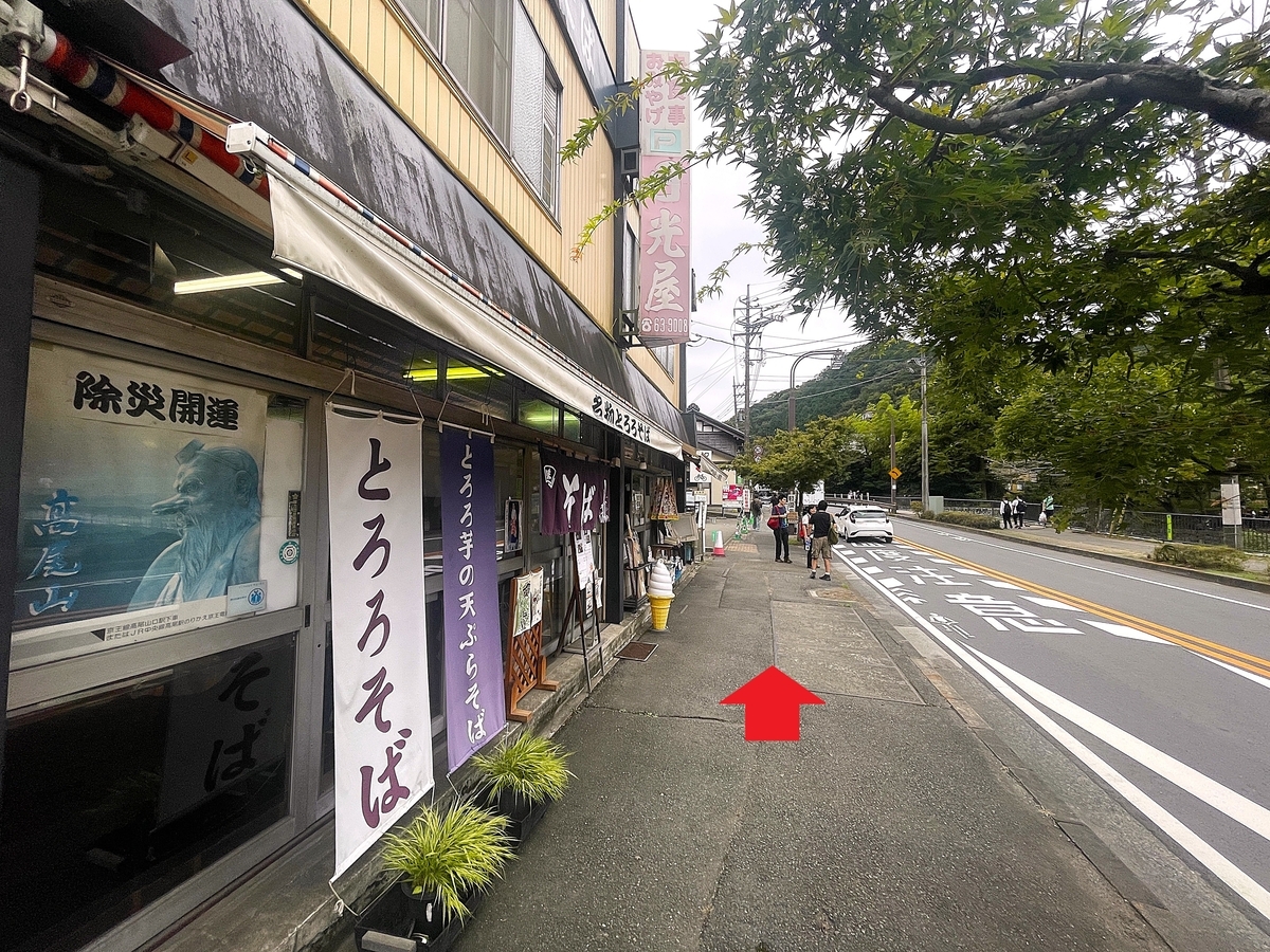 高尾山口駅の改札を出たらロータリー正面の西氷川橋を渡り、突き当りの高尾山口駅前交差点を右折して甲州街道へ。