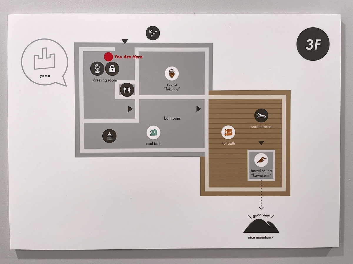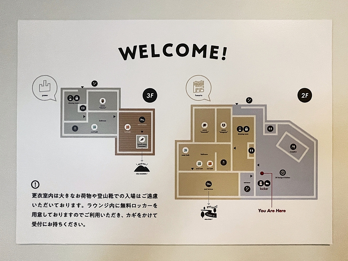 そしてコチラはTAKAO36SAUNAさんの館内案内図。館内に二つの浴室があります。