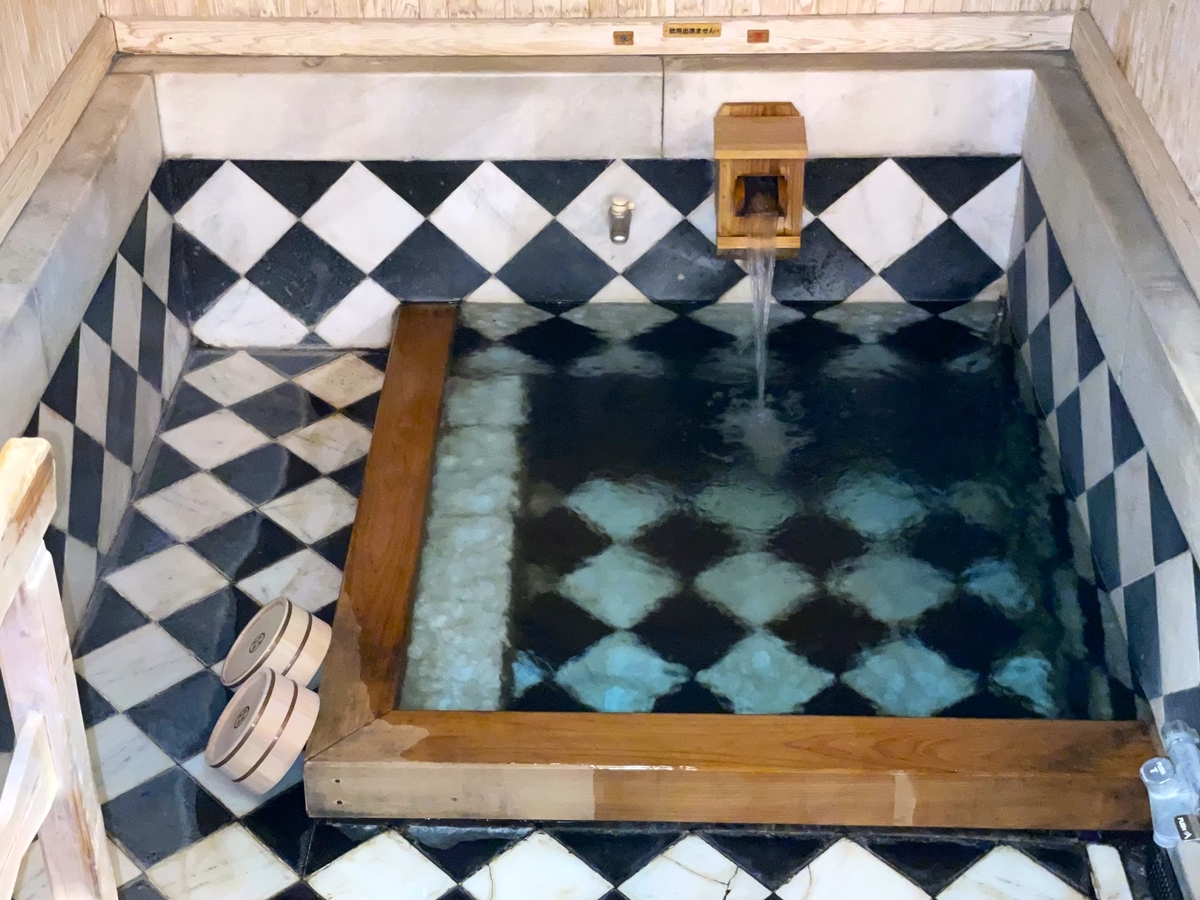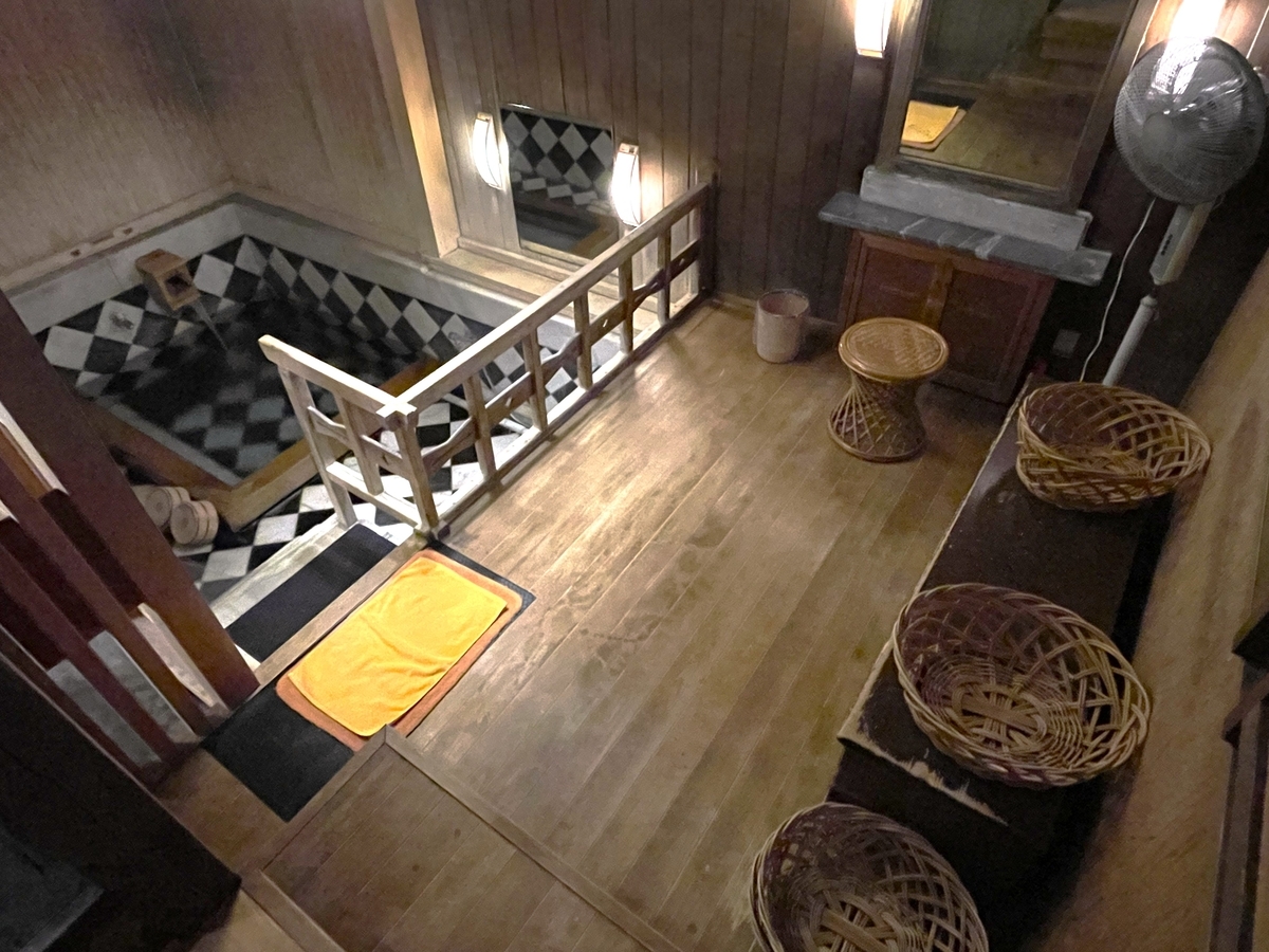 仄暗い浴室には脱衣場があり、そこから一段下がったところに市松模様の浴槽。
