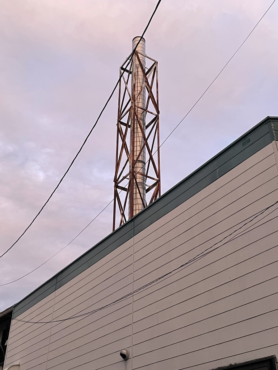 建屋の脇からは夕空に屹立する龍の湯さんの煙突も拝む事が出来ました。