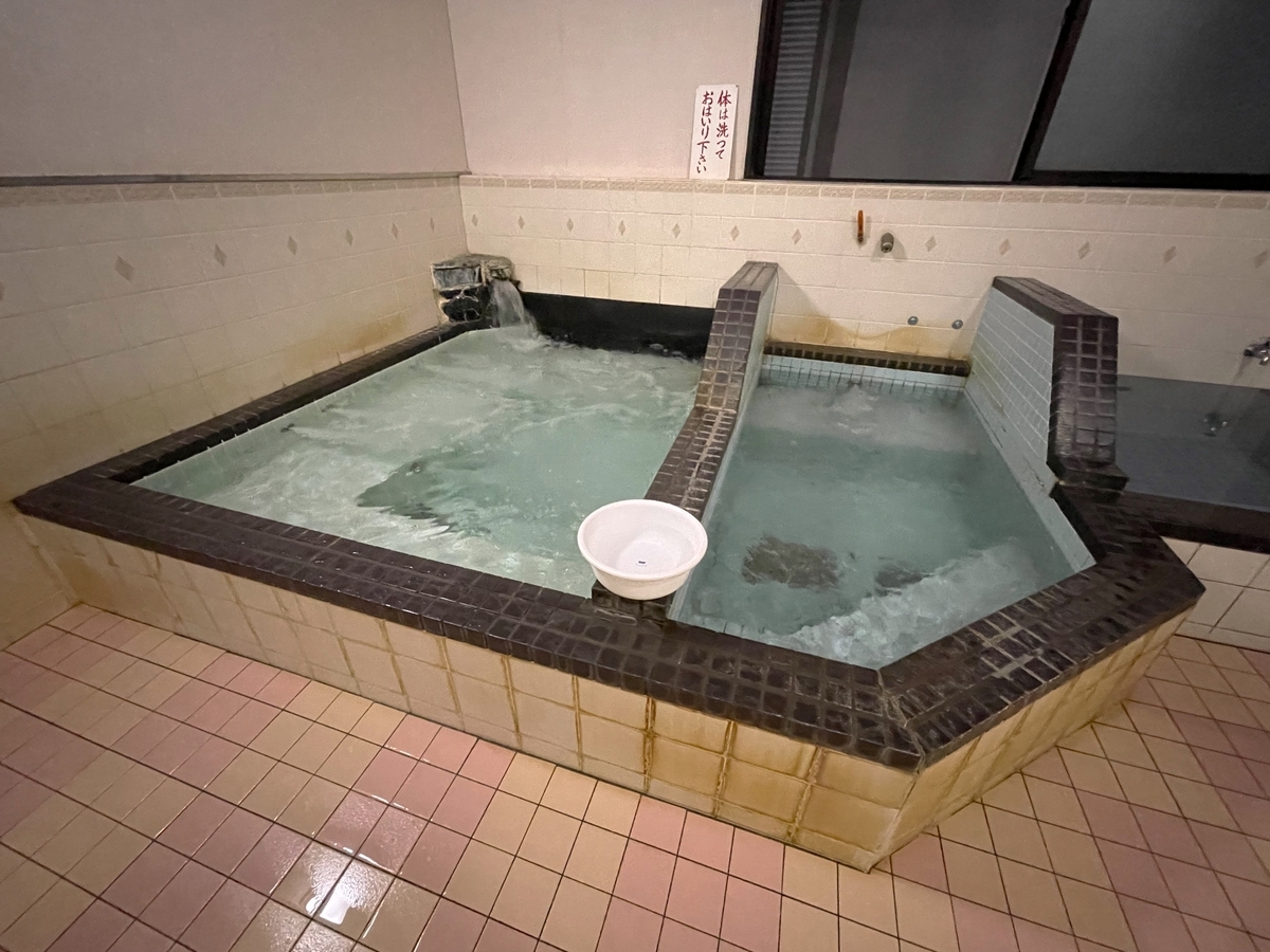 浴槽は奥が適温湯(40℃)で手前が熱湯(44℃)。共にジェットバス付。