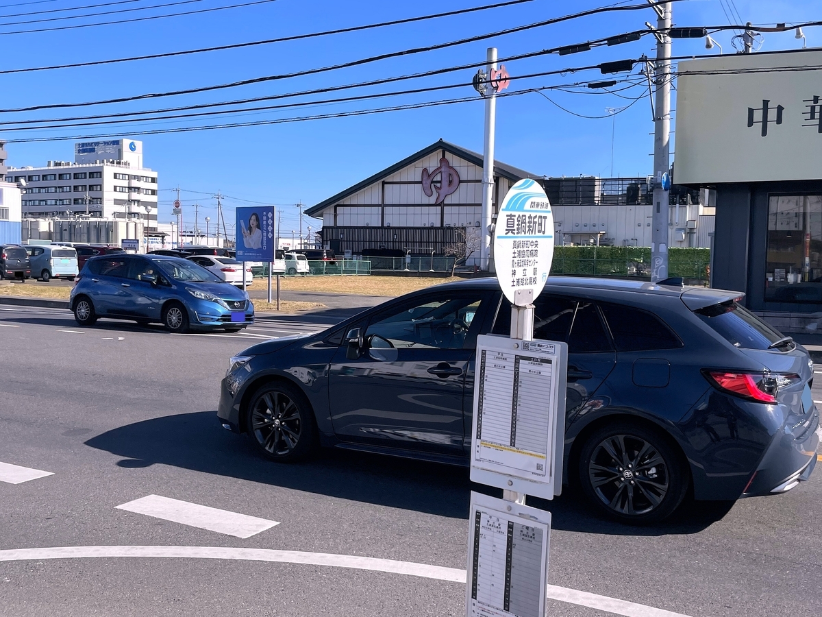最寄りの真鍋新町バス停からバス進行方向に「ゆ」の看板が見えます。