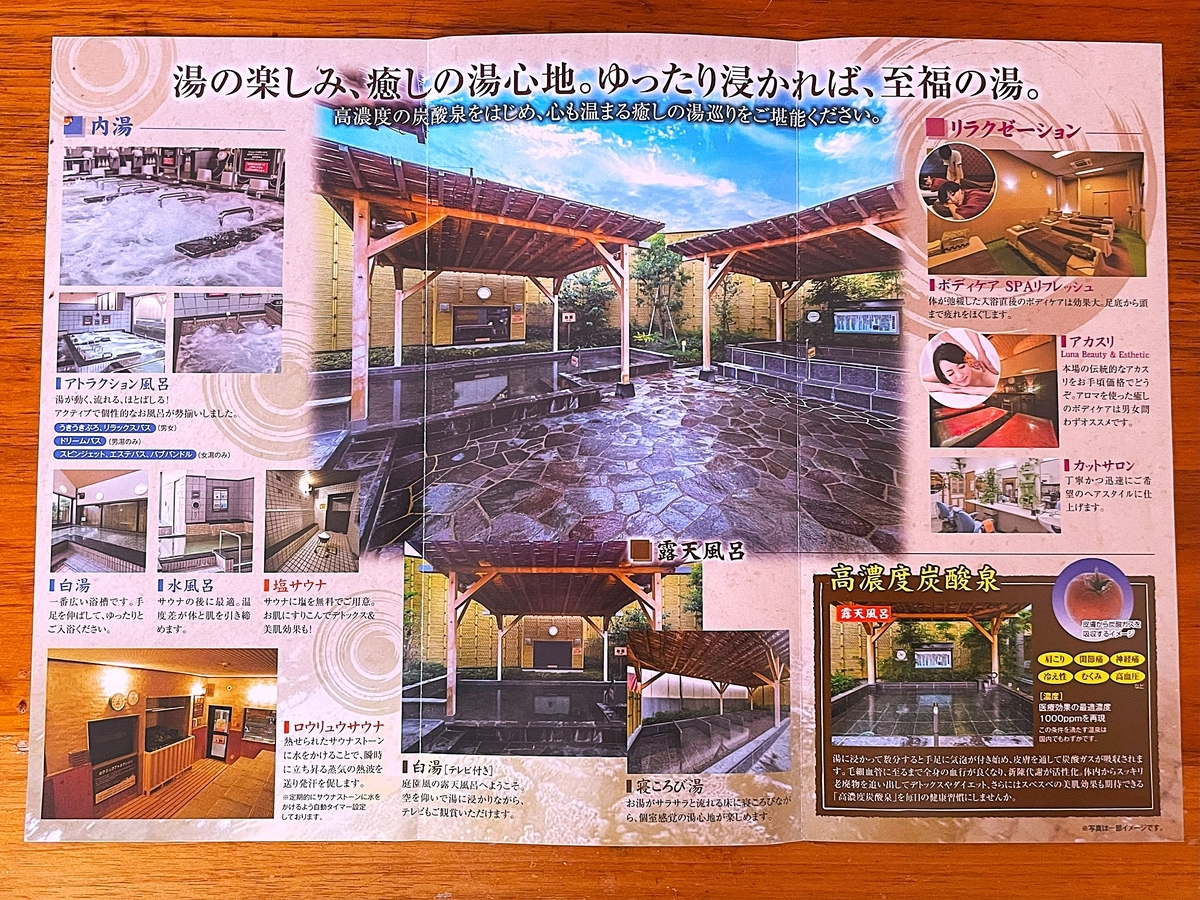 以前は使用許可が下りたのですが、最近、湯楽の里グループではHP等の写真の転載もNGとの事ですので、浴室内の模様はパンフレットの写真をご覧頂きながらレポートを進めさせて頂きます。